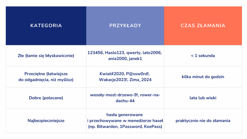 W praktyce najlepiej sprawdzają się długie hasła–frazy (passphrase), które: