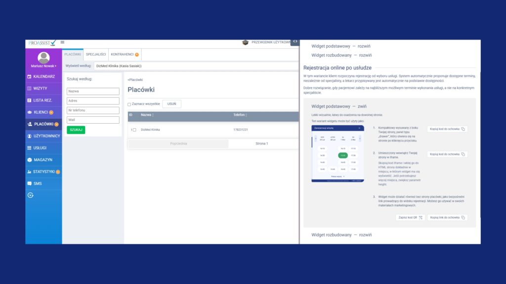 W obszarze widgetów pojawił się także kod QR, który prowadzi do statycznej wersji rejestracji online. To dodatkowy, prosty sposób na udostępnianie zapisu pacjentom, np. w materiałach drukowanych, przy recepcji, w social mediach czy w komunikacji bezpośredniej. To funkcja z dużym potencjałem marketingowym i sprzedażowym. Zeskanowanie kodu może od razu przenieść pacjenta do rejestracji, bez konieczności przepisywania adresu strony.