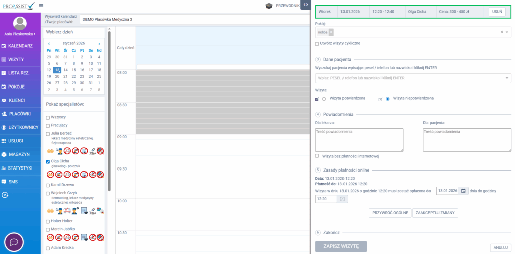 Jedną z najczęstszych przyczyn przerw w grafiku lekarzy są pacjenci, którzy zapisują się na wizytę, ale ostatecznie się nie pojawiają. W najnowszej wersji Proassist wprowadziliśmy rozwiązanie, które realnie pomaga temu zapobiec – zasadę przedpłaty dla pacjentów pierwszorazowych.
